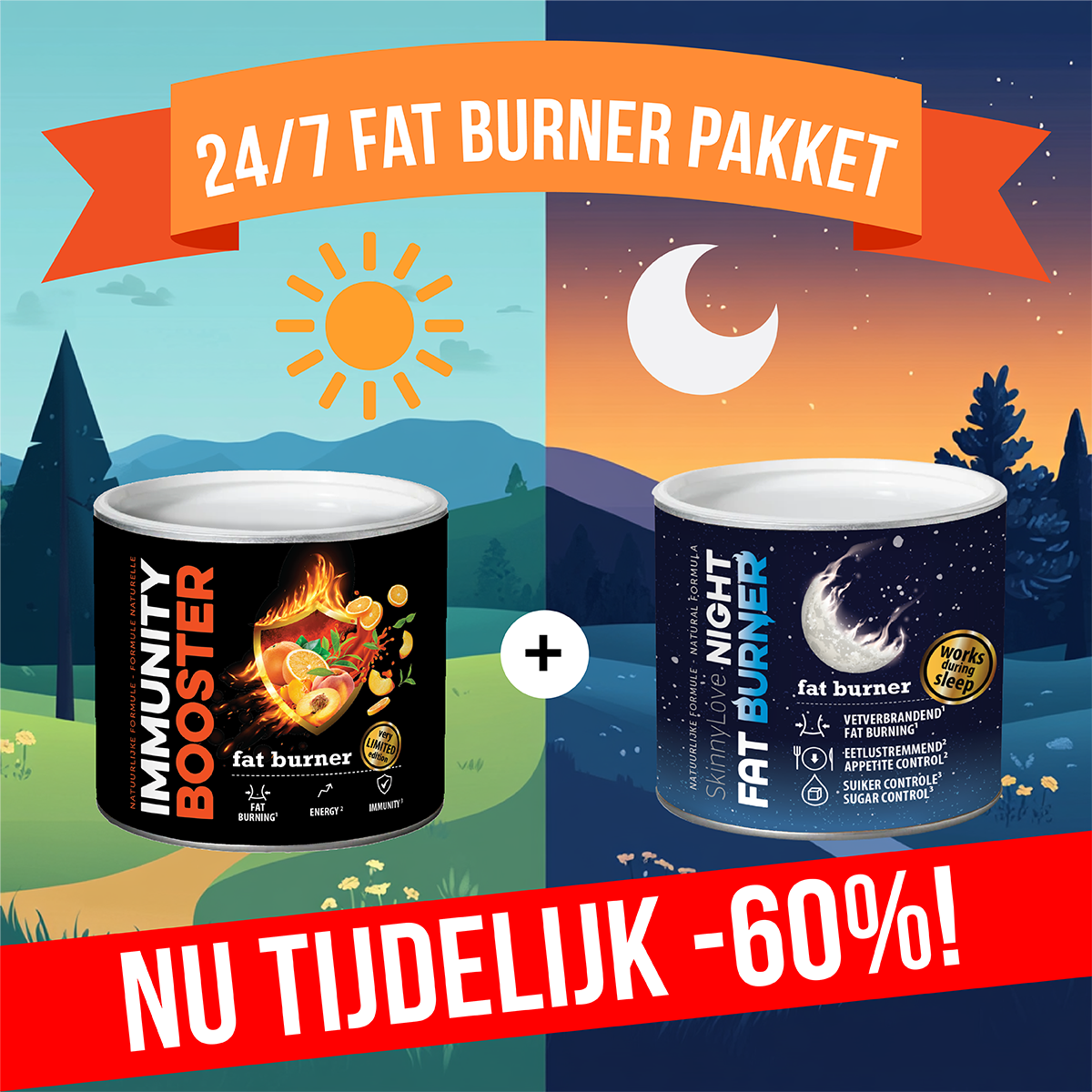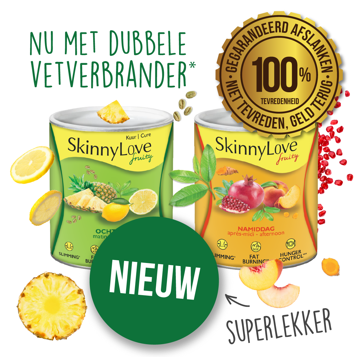 ✓ SkinnyLove, Immunity Booster, Summer Booster en Holiday Booster zijn erkende voedingssupplementen. * 100% afslankgarantie bij SkinnyLove vermageringskuur (2x 500g) : niet tevreden, geld terug (meer info ») Bij morbide obesiteit zal SkinnyLove je goed kunnen helpen; vanwege de gevaren die gepaard gaan met dit type overgewicht adviseren we je tegelijk hierover te spreken met je behandelende arts. ¹ Camellia sinensis / Opuntia ficusindica / Matcha groene thee ondersteunt de gewichtscontrole en heeft een gunstige invloed op het vetmetabolisme. ² Curcuma longa / Opuntia ficusindica heeft een gunstige invloed op het vetmetabolisme. ³ Cinnamomum cassia / Zingiber officinale draagt bij tot de instandhouding van normale bloedsuikergehalten. ⁴ Zingiber officinale / Curcuma longa / Panax ginseng / Vitamine C draagt bij tot de normale werking van het immuunsysteem en de natuurlijke weerstand van het lichaam. ⁵ Zingiber officinale draagt bij tot verbeterde energie en heeft een verkwikkende werking bij vermoeidheid. ⁶ Rosmarinus officinales ondersteunt de inwendige reiniging en de normale leverwerking. ⁷ Curcuma longa en Piper nigrum bevorderen de huidgezondheid en houden je uiterlijk fris en jeugdig. Piper nigrum is een antioxidant en beschermt de huid tegen vrije radicalen. ⁸ Vitamine C draagt bij tot de normale collageenvorming voor normale werking van de huid. ⁹ Johannesbroodpitmeel / Carobe vermindert het hongergevoel en beperkt de cravings. ¹⁰ Vezelrijk product. ¹¹ Vaccinium myrtillus ondersteunt de spijsvertering. ¹² Thymus vulgaris heeft een kalmerende werking op de luchtwegen en werkt verzachtend op de keel. Daarnaast ondersteunt het de afscheiding van slijmen in de bovenste luchtwegen. Salvia officinalis heeft een verzachtende werking op de keel en biedt verlichting bij droge hoest. ¹³ Ginseng helpt bij het onderhouden van goede seksuele relaties. ¹⁴ Bèta-glucanen uit haver verlagen de cholesterol. Een hoog cholesterolgehalte is een risicofactor voor de ontwikkeling van hart- en vaatziekten. Voor het bekomen van een cholesterolverlagend effect is een dagelijkse inname van 3g bèta-glucanen nodig of 6 SkinnyLove Crackers per dag. ¹⁵ Bevat cafeïne, deze bevordert de alertheid. ¹⁶ Kurkuma draagt bij tot het behoud van soepele gewrichten en spieren. ¹⁷ Brandnetel ondersteunt de gewrichten. ¹⁸ Biotine en zink dragen bij tot de instandhouding van een normale huid. Vitamine C draagt bij tot de normale collageenvorming voor de normale werking van de huid. ¹⁹ Zink en selen dragen bij tot de bescherming van cellen tegen oxidatieve stress. ²⁰ Zink speelt een rol in het celdelingsproces. ²¹ Choline bevordert het normaal vetmetabolisme, wat helpt bij gewichtsverlies. ²² Chroom draagt bij tot het behoud van normale bloedsuikerspiegels ²³ Fenegriek ondersteunt het koolhydraat- en het vetmetabolisme en draagt bij tot het behoud van normaal bloedsuikermetabolisme. ²⁴ Effecten van een voedingssupplement gericht op de controle van de bloedglucose om te helpen bij gewichtsbeheersing, wat invloed heeft op eetlust, honger en verzadiging.